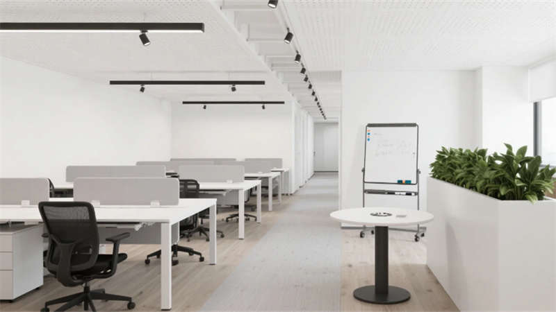室內空間延續外立面設計語言,企業大堂通過技術創新實現淺白大理石與木紋墻面的無縫拼接,懸浮式線性燈光系統可隨自然光線智能調節色溫。開放式辦公區配置智慧化模塊組合,可升降桌體與軌道射燈靈活適配多元場景,協作島集成無線充電與環境感知功能。高管辦公室采用智能霧化玻璃隔斷,實現隱私與通透的自由切換。科技會議室搭載高清透明顯示系統與多聲道聲學設備,電動百葉簾與補光系統聯動打造智能會議環境。