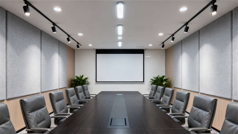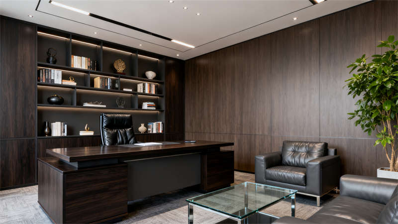 總經理辦公室打造獨立私密的辦公環境,實木家具傳遞沉穩質感,真皮沙發與茶幾構建舒適的接待空間,書架的設置既實用又增添文化氛圍。會議室圍繞高效溝通需求設計,合理的座椅布局與投影設備搭配,墻面吸音板的運用保障音質清晰。?