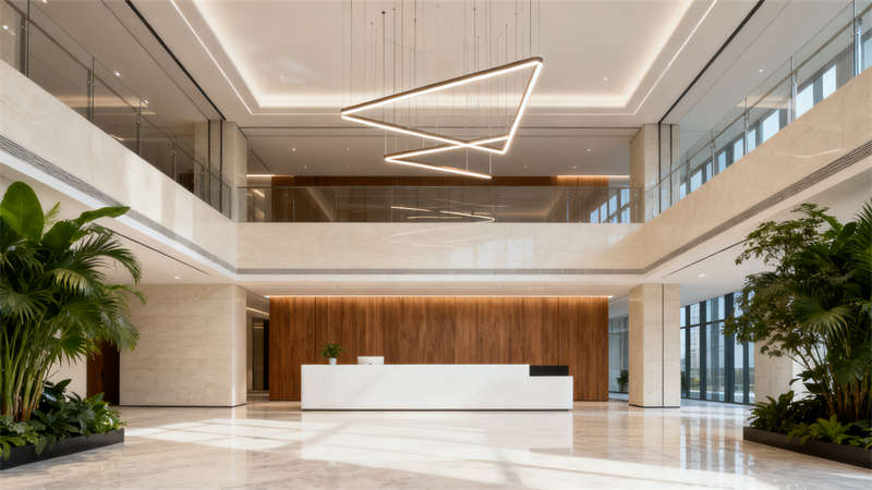 室內空間設計從功能需求出發,大堂采用挑高布局增強開闊感,大理石材質的運用提升空間格調,藝術吊燈與綠植的搭配增添靈動氣息,營造出大氣且溫馨的入口氛圍。標準辦公區以開放式布局為主,合理的工位隔斷兼顧協作與隱私,柔和的條形燈帶提供舒適照明,助力高效辦公。?