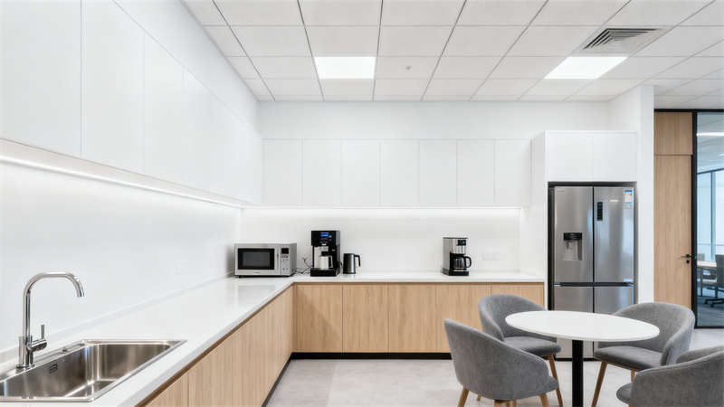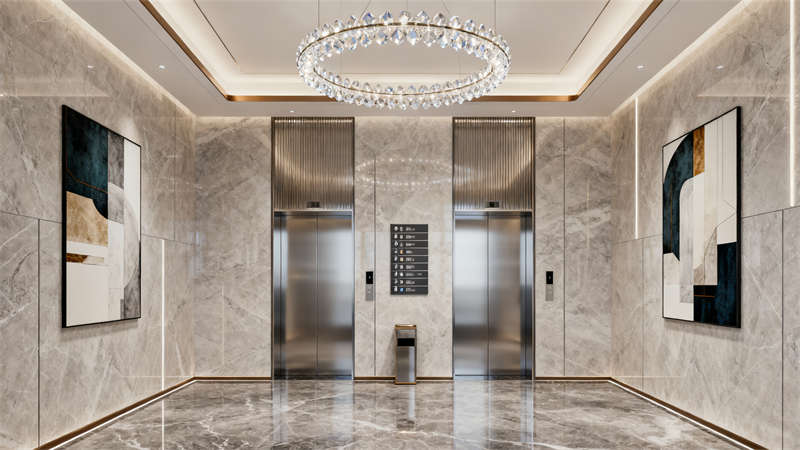 茶水間兼顧實用與休閑屬性,齊全的設備滿足日常需求,休閑桌椅的設置為員工提供放松空間。電梯廳延續整體簡約風格,大理石材質與裝飾畫、水晶吊燈的搭配,提升空間精致感,指示牌的清晰設置保障通行便捷。