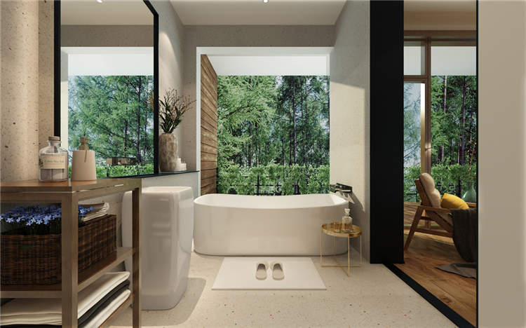 整個(gè)度假酒店設(shè)計(jì)的材料均以原木為主,以此來表達(dá)一種親近生態(tài)的質(zhì)感。再配以民宿建筑風(fēng)格的設(shè)計(jì)方式,不僅凸顯了度假酒店的“材質(zhì)”,同時(shí)也有一種返璞歸真的歸屬感。