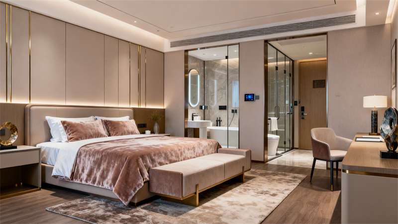 室內空間裝修圍繞不同功能場景精準發力。大堂以開闊通透為基調,地面選用質感石材鋪設,墻面搭配柔和的肌理材質與藝術裝飾,接待區設計簡約大氣,搭配舒適的休憩座椅,營造出溫馨且有格調的迎賓空間;行政套房注重私密性與舒適度,裝修上采用柔和的色彩搭配,床頭背景墻融入精致紋樣,家具選用簡約實用款式,衛生間做干濕分離設計,搭配品質衛浴設施,讓入住體驗更顯愜意;全日制餐廳裝修兼顧實用性與氛圍營造,開放式布局搭配半私密卡座,餐桌椅選用耐用且美觀的款式,墻面點綴綠植與藝術掛畫,燈光采用暖色調,打造出適合用餐的輕松環境;多功能宴會廳以靈活實用為核心,裝修上采用簡潔的吊頂設計與可調節燈光系統,墻面選用大氣的裝飾材質,地面鋪設耐磨易清潔的材料,滿足不同活動需求;行政酒廊裝修凸顯雅致感,柔和的燈光、舒適的沙發搭配質感裝飾,為賓客提供放松交流的空間;健身中心裝修注重功能性,通透的玻璃隔斷、專業的運動地板搭配齊全的健身設備,營造活力氛圍;室內泳池裝修以靜謐舒適為主,無邊際設計搭配自然光線引入,池邊布置休閑躺椅,讓賓客盡享放松時刻。