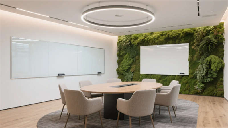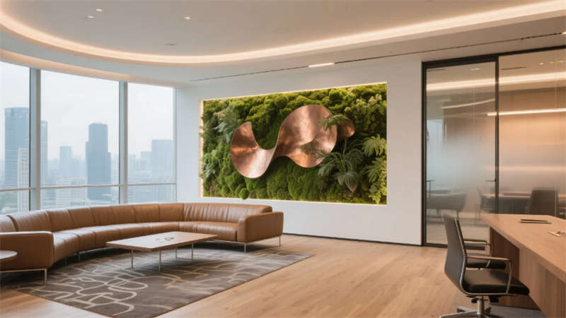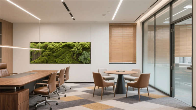 生態(tài)科技體系覆蓋全場(chǎng)景:經(jīng)理辦公室苔蘚墻集成空氣監(jiān)測(cè)系統(tǒng),總裁室霧化玻璃聯(lián)動(dòng)光伏發(fā)電,小會(huì)議室綠植墻搭載微滴灌節(jié)水裝置。材質(zhì)選用安徽本土元素升級(jí)再造,大廳水磨石摻入大別山礦石粉,定制地毯紋樣提取徽派窗欞數(shù)字化變體。