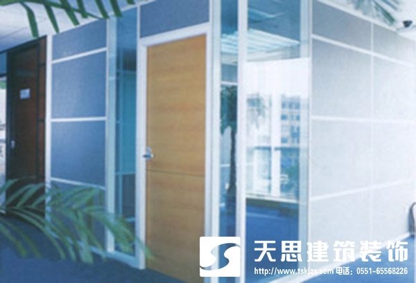 從專業角度來講玻璃隔斷墻因稱為透光模塊隔斷墻,玻璃隔斷中又分單面邊置、單面中置、雙面、雙面帶橫檔、雙面內置百葉簾等多種方式。在玻璃隔斷墻的安裝中,安徽天思建筑辦公室裝修設計公司考慮到使用功能的不同,做如下設計建議: