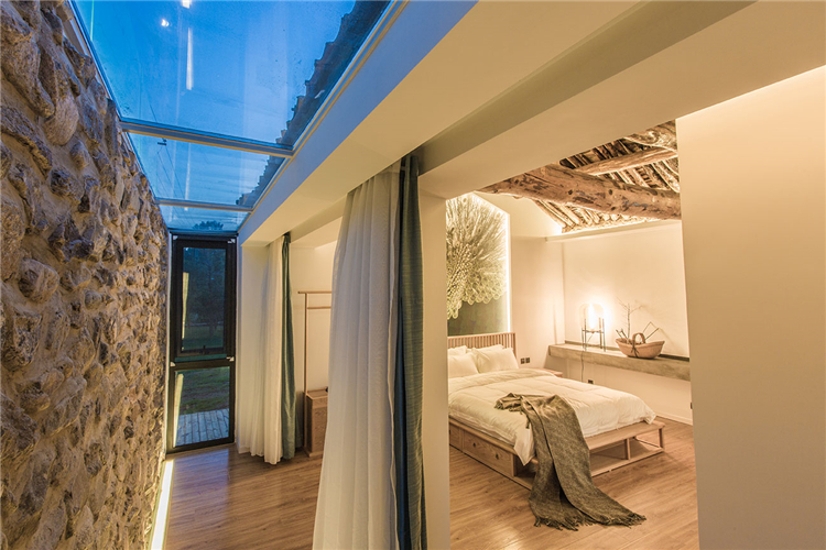 “隨著越來越快的生活節(jié)奏我們每天奔忙,每天遺忘城市越來越近,鄉(xiāng)村卻越來越遠(yuǎn)”。這所名為“畫框里”的民宿位于水泉子村,而名字寓意為將百里畫廊的山水美景留在畫中院中。可看到名副其實(shí)靈動的山水畫這四季的變幻,凝集了我們對生活所有的向往。落地窗邊放置了浴缸做一個泡泡浴一眼望去是院落的美景和遠(yuǎn)山的意境。主臥空間很寬敞,新中式的原木配灰色的簡易家具些許的現(xiàn)代元素金屬攝影燈使房間內(nèi)多一份輕松感。