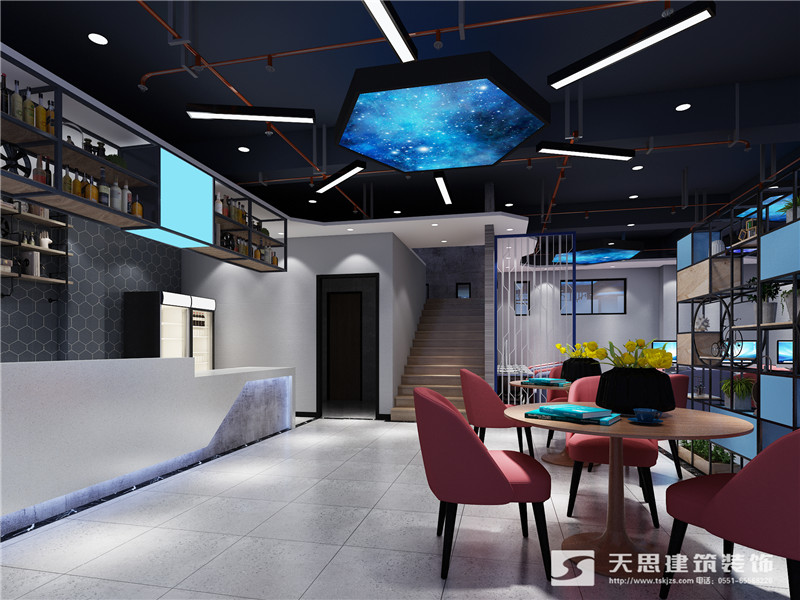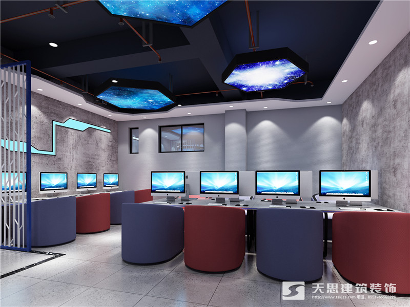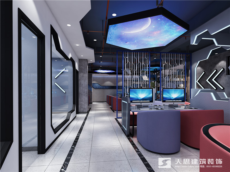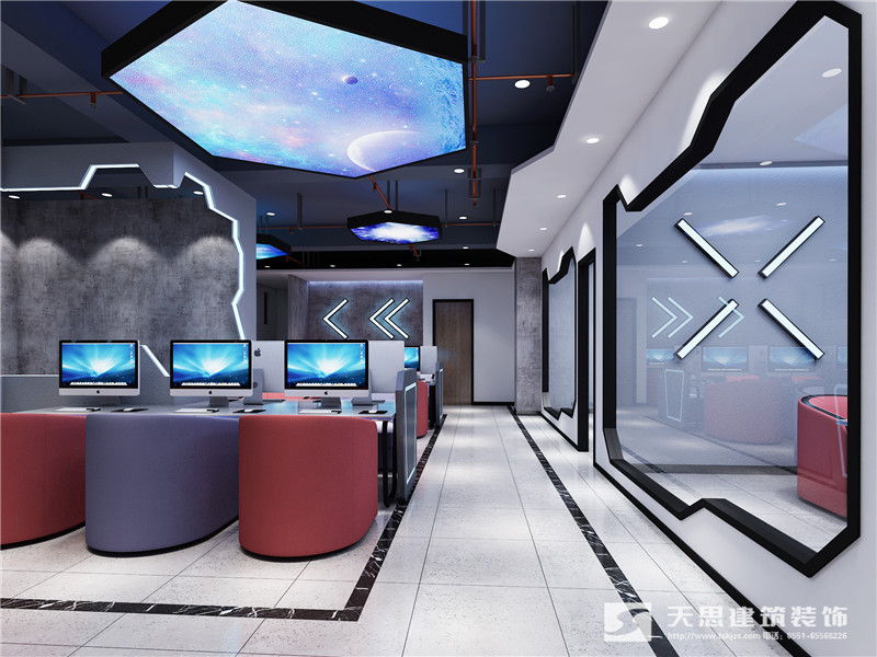 根據(jù)業(yè)主的要求,網(wǎng)咖設(shè)計(jì)的整體顏色以淺色為主,中間穿插對比強(qiáng)烈的撞色系來展現(xiàn)效果。