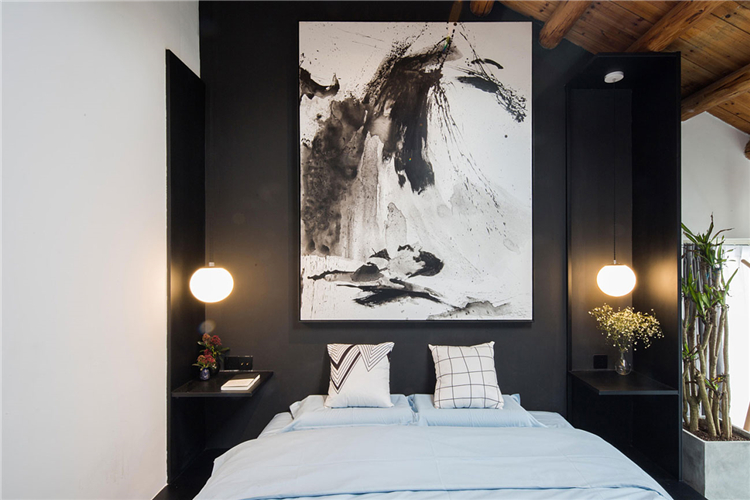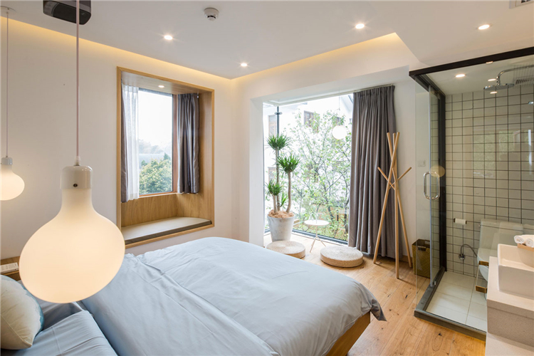 設計采用了未經加工的天然褐色原木及灰色砌磚來營造溫馨怡人的原始氛圍,安靜、私密和精致。酒店整體現代禪意簡約風格設計,深色的主基調,本土粗獷肌理的石材、手工質感的漆面、黑色系的木頭、適度的鋼架結構、全實木的家具,配合棉麻的窗簾、羊毛的地毯、密織埃及棉的床上用品,冷峻和溫暖的相輔相成,成為一個溪流邊休養生息的家,隔絕繁雜城市生活的安靜避風港。