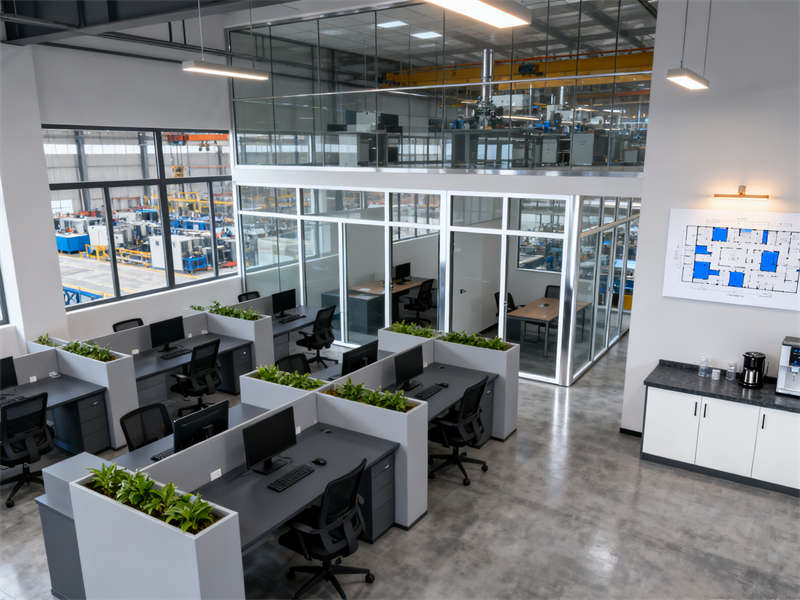 成品檢驗區配備精密檢測儀器,合理的分區設計與適宜的照明,為精準檢測提供保障。員工辦公區與休息區則兼顧實用性與舒適度,開放式辦公布局搭配獨立辦公室,休息區的沙發、餐柜等設施,為員工營造出良好的工作與放松環境。整體設計在色彩與材質運用上保持高度統一,既體現工業廠房的專業特質,又增添了人性化氛圍。?