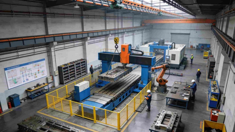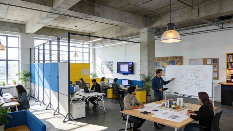 生產區域按需分區:十萬級潔凈電子車間以灰白為主調,配備自動化流水線與防靜電系統;重型設備組裝車間采用耐磨地坪與行車軌道,色彩對比鮮明。辦公區域兼顧協作與專注,開放式卡位、創意辦公區與研發專注艙合理布局,裸頂工藝、原木元素與綠植點綴,平衡工業感與舒適度。
