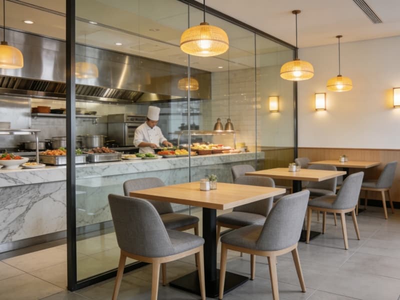 酒店一層為公共區域,大堂地面鋪淺灰色大理石,前臺背景墻以巖板結合藝術裝置,彰顯格調。大堂吧設半私密卡座,供客人休憩交流。全日制餐廳配備開放式廚房,可讓客人直觀感受美食制作過程。