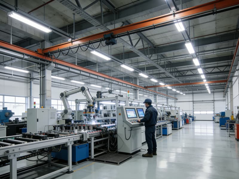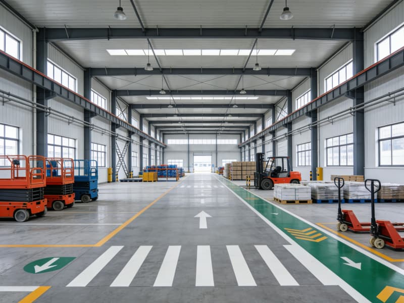 步入內部,生產區域空間開闊,頂部采用裸露的鋼梁結構,搭配軌道式的照明燈具,保證充足且均勻的光線,滿足高強度的生產作業需求。地面鋪設耐磨的環氧樹脂地坪,不僅耐用,還易于清潔和維護。