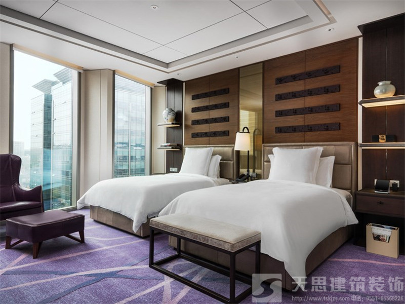 配套設(shè)施:客房的配電設(shè)計(jì)要細(xì)致周到,方便使用.配電箱通常結(jié)合空調(diào)檢修孔人設(shè)計(jì)在吊頂里.衣櫥的深度要大于0.6米,總寬度要大于1米.此外還要有存放備品的地方.壁櫥內(nèi)應(yīng)有良好的照明設(shè)計(jì).保險(xiǎn)柜可設(shè)在衣櫥或電視柜下面.寬帶網(wǎng)插座通常結(jié)合手機(jī)充電電源設(shè)置在化妝臺(tái)抽屜里.套間設(shè)計(jì):套間常設(shè)在走廊的端部或建筑的轉(zhuǎn)角處(如四季大酒店).在套間的起居室和臥室之間設(shè)一個(gè)帶門的小過(guò)廳,這樣可以在必要時(shí)把每間房分租出去.每間客房最好有獨(dú)立的衛(wèi)生間,以便單獨(dú)出租時(shí)使用.