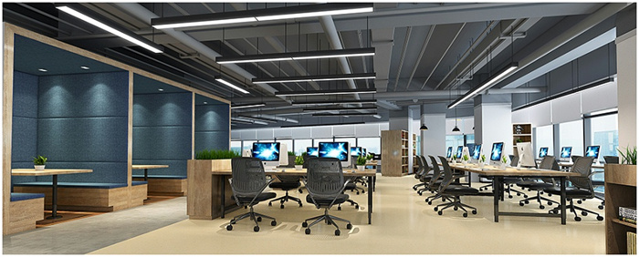 2、該辦公室裝修項目主要是使用者作為科技類產品的研發空間,要求足夠寬敞,空間的開放度與靈活度自由變換,辦公桌實現可隨意拼裝組合。設計師在設計上立足于;靈活共享的主線,以設計、現代、開放和連通為主題,著眼于科技發展的今天和未來,創造出一個極富時代感和超前性的辦公空間。整個辦公空間以白色為基底色,輔以藍色的協調、中和,黑、 白、藍成為標準層的主色系,完美將辦公層的空間格局進行分割,營造出現代簡約、自由開放的高端科技感。長方形燈具應用突出了現代科技的嚴謹態度,極大凸顯企業的文化感與產品前沿的設計感。會議室根據實際需求,實際軟裝時則以多彩元素為主題,一眼望去 ,布滿了明快的顏色 ,活潑卻不繁雜 ,采用的半透明亞克力玻璃椅是點睛之筆,帶給空間無限的靈動感。黑板漆墻面設計則豐富了使用者的功能需求,達到裝飾和功能并存的目的。靈活的辦公桌還可自由變換,滿足不同需求的會議要求。