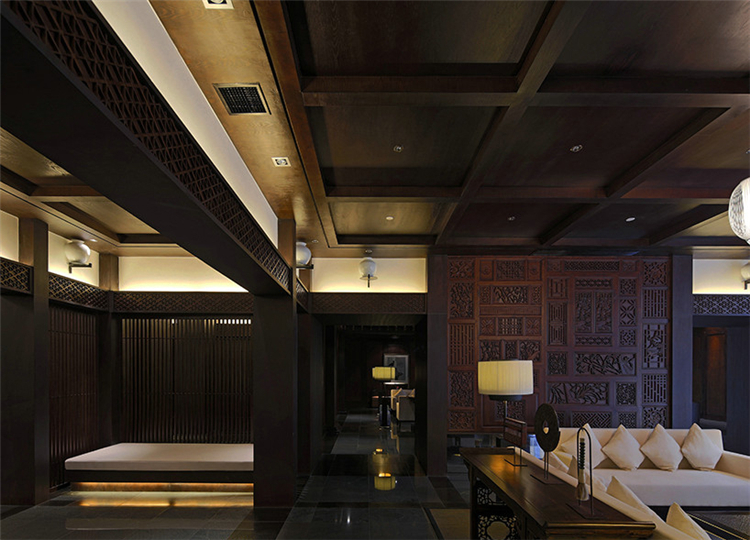 穿過悠長的走道,在灰白色空間配合溫暖沉著木色格子窗棱,讓客人逐步感受一種優雅的熱情。天花的黑色線條設計,帶有極強的導向性,墻面上特別設計的壁燈,與柱體結合,極大地豐富整個空間的層次感和趣味性。