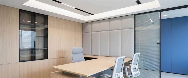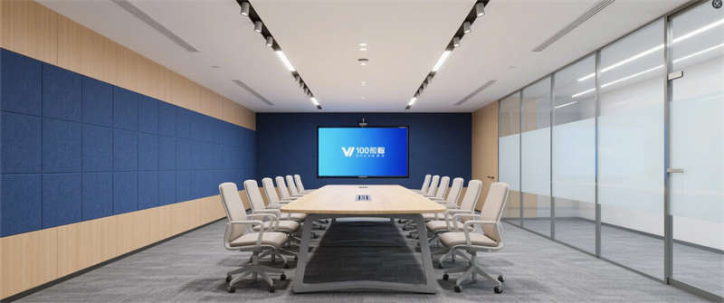 智能會議室:深藍色吸音墻面呼應(yīng)企業(yè)VI色,智能屏幕與玻璃隔斷凸顯科技屬性;