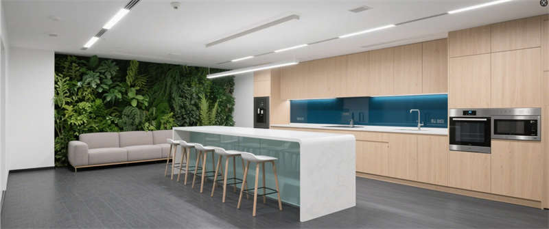 休閑茶水間:白色吧臺與綠植墻營造松弛氛圍,地膠材質(zhì)耐磨易清潔。