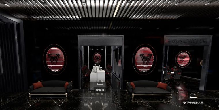 在迎賓區(qū)兩邊,左右分布著男賓區(qū)和女賓區(qū)。相較于普通網(wǎng)咖設(shè)計,電競會館具有賽事承辦上的專業(yè)特色,為了使人更加有比賽所需專注,男賓區(qū)墻面只有簡單的涂鴉,飾物元素也極少,相較于男賓區(qū)設(shè)計較為簡單,女賓區(qū)“紅蜘蛛”主題感十足,頂墻燈光合理搭配來減少黑色來的的壓抑感。男女獨立衛(wèi)生間分別分布在兩個區(qū)域,非常人性化。