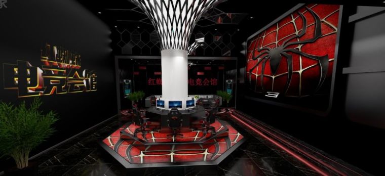 從迎賓區(qū)直接進(jìn)入后,來到最為核心的競技比賽區(qū),滿足電競游戲里開黑等座位聚集需要,非常創(chuàng)意性地在空間中加入了圓柱設(shè)計,空間里最大亮點是圓柱臺有規(guī)律交錯的線條與“紅蜘蛛”背景墻交相呼應(yīng),打造了成為了“蜘蛛網(wǎng)”的元素,讓整個核心空間與主題完美契合。