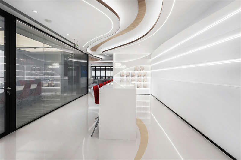 整個(gè)空間呈現(xiàn)出輕盈的姿態(tài),大面積留白給予空間呼吸感,曲線流動(dòng)的造型就像一根善于變化而纖細(xì)不驚的絲線,即將牽引出一次次關(guān)于未來的探索。