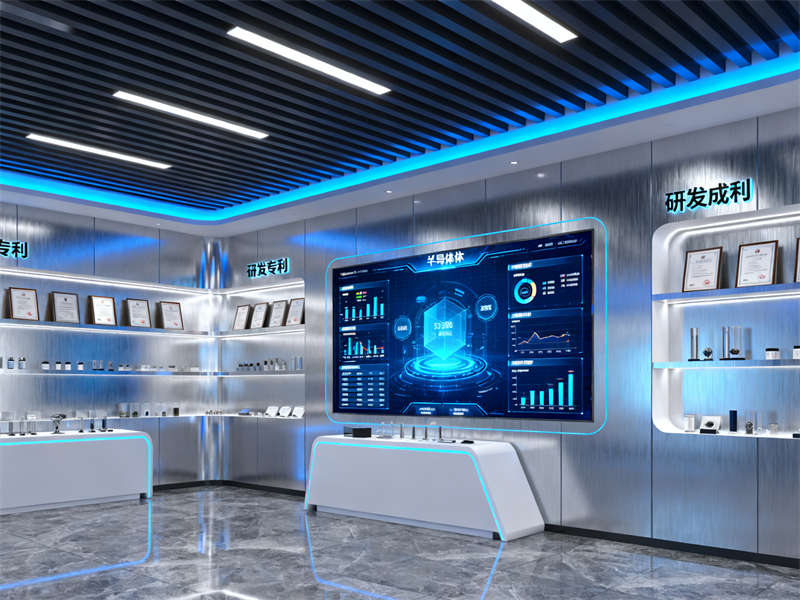 展廳入口處設置了沉浸式視覺裝置,通過光影效果模擬半導體芯片的微觀結構,讓參觀者剛進入就能直觀感受到行業特性。往里走,核心展示區采用開放式布局,搭配通透的玻璃展柜與懸浮式展臺,既方便參觀者近距離觀察展品,又能讓空間顯得開闊不壓抑。展示區旁設置了互動體驗區,裝修上融入了柔和的木質元素,平衡科技感帶來的冷峻,讓參觀者在互動過程中更顯舒適。?