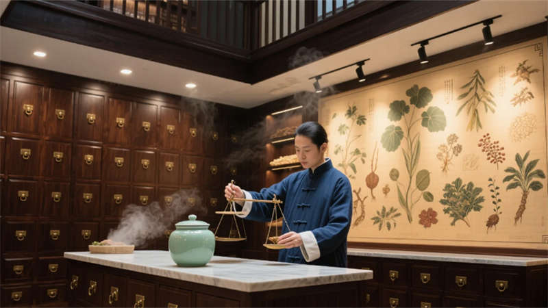 針灸室格柵隔斷透出晨光竹影,經絡圖前銀針泛著柔光;文化長廊地面流動篆書金句,引領視線穿透月洞門望向煎藥銅鍋升騰的薄霧。茶療區古茶樹畔,藥汽氤氳于青花茶盞,百草浮雕墻下藤椅邀人小憩。